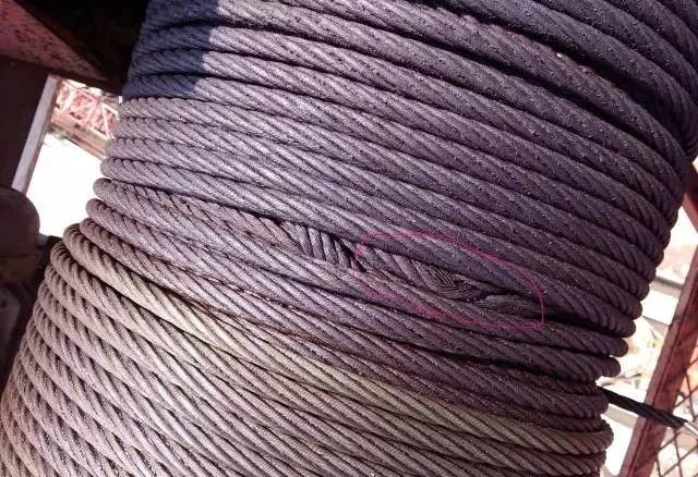 2.缺陷:单股钢丝绳 绳芯挤出 处理:立即报废